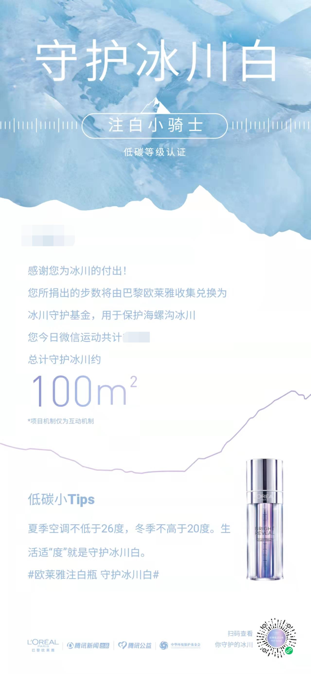 為了能更好地體現(xiàn)“守護(hù)肌膚凈白”的理念,巴黎歐萊雅和新聞機(jī)構(gòu)還共同發(fā)起了“守護(hù)冰川白”公益事件,據(jù)悉,注白瓶保護(hù)冰川的初衷是“守護(hù)肌膚凈白,也守護(hù)地球最后一片凈白”。該活動旨在通過呼吁低碳生活方式,促進(jìn)減排并由此為保護(hù)冰川貢獻(xiàn)力量。