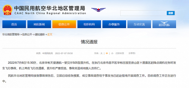 據(jù)民航局華北地區(qū)管理局網(wǎng)站7月7日消息,2022年7月6日15:30許,北京華彬天星通航一架貝爾505型直升機,在執(zhí)行北京市昌平區(qū)華彬莊園至房山區(qū)十渡景區(qū)起降點調(diào)機任務(wù)時發(fā)生飛行事故,機上兩名飛行員遇難,直升機嚴(yán)重受損,事故未造成地面人員傷亡。