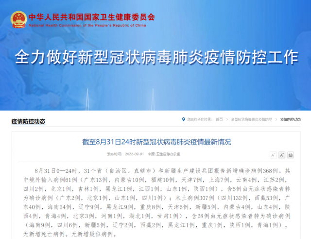 8月31日0—24時,31個省(自治區(qū)、直轄市)和新疆生產建設兵團報告新增確診病例368例。其中境外輸入病例61例(廣東13例,內蒙古10例,福建10例,天津7例,上海7例,云南4例,江蘇2例,四川2例,北京1例,吉林1例,黑龍江1例,江西1例,山東1例,陜西1例),含5例由無癥狀感染者轉為確診病例(廣東2例,北京1例,山東1例,四川1例);本土病例307例(四川132例,西藏53例,廣東40例,海南24例,遼寧9例,黑龍江9例,重慶8例,天津5例,新疆5例,內蒙古4例,山東4例,陜西4例,青海4例,北京3例,河南1例,湖北1例,甘肅1例),含28例由無癥狀感染者轉為確診病例(海南9例,四川6例,新疆5例,遼寧2例,西藏2例,黑龍江1例,重慶1例,陜西1例,青海1例)。無新增死亡病例。無新增疑似病例。