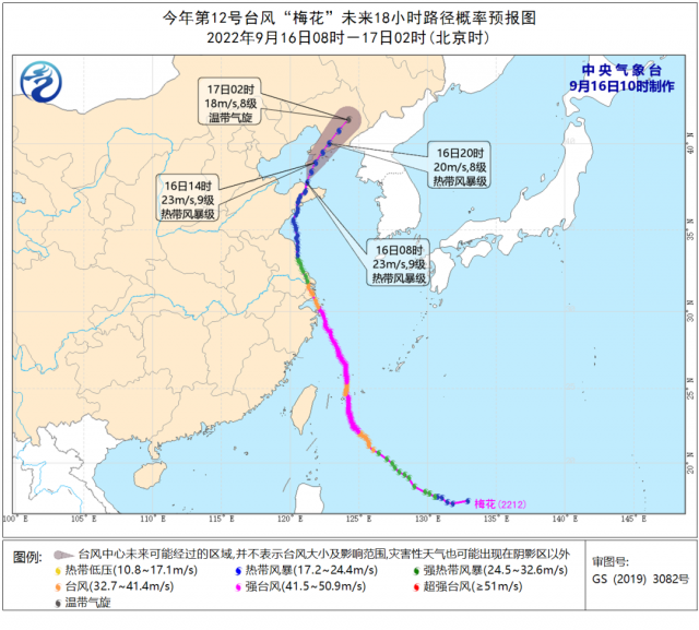 臺風(fēng)“梅花”未來24小時(shí)路徑概率預(yù)報(bào)圖(2022年9月16日8時(shí)至17日2時(shí)) 來源:中央氣象臺