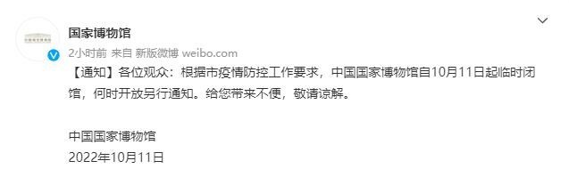 國家博物館10月10日發(fā)布通知稱,根據(jù)市疫情防控工作要求,中國國家博物館自10月11日起臨時閉館,何時開放另行通知。給您帶來不便,敬請諒解。