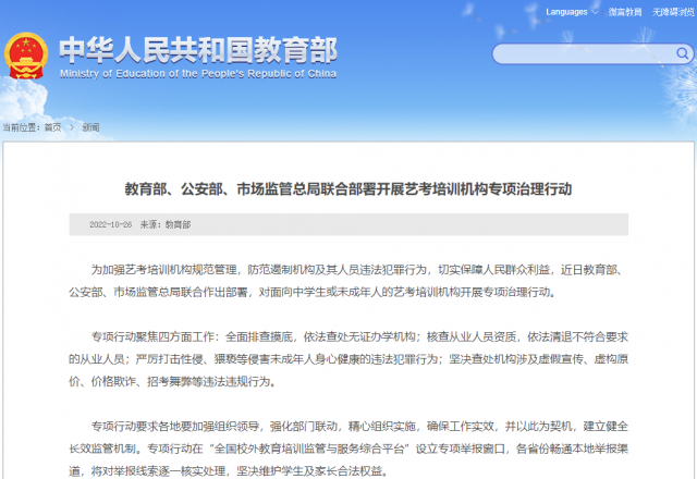 據(jù)教育部網(wǎng)站消息,為加強(qiáng)藝考培訓(xùn)機(jī)構(gòu)規(guī)范管理,防范遏制機(jī)構(gòu)及其人員違法犯罪行為,切實(shí)保障人民群眾利益,近日教育部、公安部、市場(chǎng)監(jiān)管總局聯(lián)合作出部署,對(duì)面向中學(xué)生或未成年人的藝考培訓(xùn)機(jī)構(gòu)開(kāi)展專項(xiàng)治理行動(dòng)。