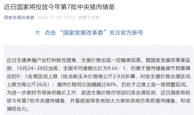據(jù)國(guó)家發(fā)改委消息,為進(jìn)一步做好市場(chǎng)保供穩(wěn)價(jià)工作,促進(jìn)生豬價(jià)格盡快回歸至合理區(qū)間,近日國(guó)家將投放今年第7批中央豬肉儲(chǔ)備,并督促指導(dǎo)各地加大力度投放地方政府豬肉儲(chǔ)備,形成調(diào)控合力。