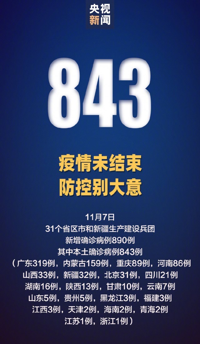 11月7日0—24時,31個?。ㄗ灾螀^(qū)、直轄市)和新疆生產(chǎn)建設(shè)兵團報告新增確診病例890例。其中境外輸入病例47例(福建12例,廣東12例,四川8例,北京5例,天津3例,上海3例,遼寧2例,江蘇1例,山東1例),含2例由無癥狀感染者轉(zhuǎn)為確診病例(廣東1例,四川1例);本土病例843例(廣東319例,內(nèi)蒙古159例,重慶89例,河南86例,山西33例,新疆32例,北京31例,四川21例,湖南16例,陜西13例,甘肅10例,云南7例,山東5例,貴州5例,黑龍江3例,福建3例,江西3例,天津2例,海南2例,青海2例,江蘇1例,浙江1例),含152例由無癥狀感染者轉(zhuǎn)為確診病例(廣東121例,甘肅9例,四川7例,北京3例,重慶3例,福建2例,湖南2例,陜西2例,山西1例,黑龍江1例,浙江1例)。無新增死亡病例。無新增疑似病例。