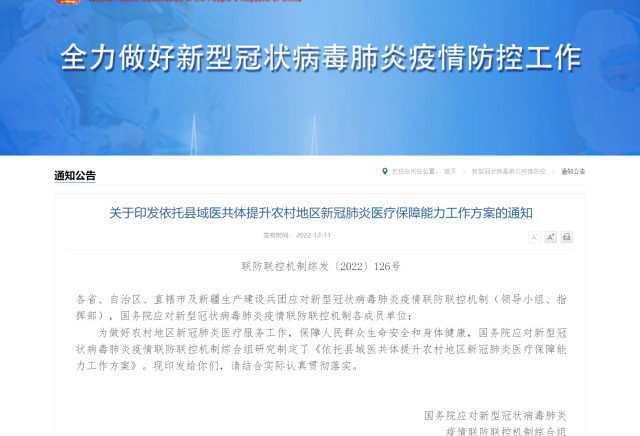 為做好農(nóng)村地區(qū)新冠肺炎醫(yī)療服務(wù)工作,保障高齡合并基礎(chǔ)疾病等重癥風(fēng)險(xiǎn)較高的感染者及時(shí)救治,在農(nóng)村地區(qū),以縣域醫(yī)共體為載體,提升縣級(jí)醫(yī)院重癥救治能力,發(fā)揮鄉(xiāng)鎮(zhèn)衛(wèi)生院和村衛(wèi)生室健康監(jiān)測(cè)作用,最大可能降低重癥率、病亡率,國務(wù)院聯(lián)防聯(lián)控機(jī)制11日發(fā)布《關(guān)于印發(fā)依托縣域醫(yī)共體提升農(nóng)村地區(qū)新冠肺炎醫(yī)療保障能力工作方案的通知》(下稱“方案”)。