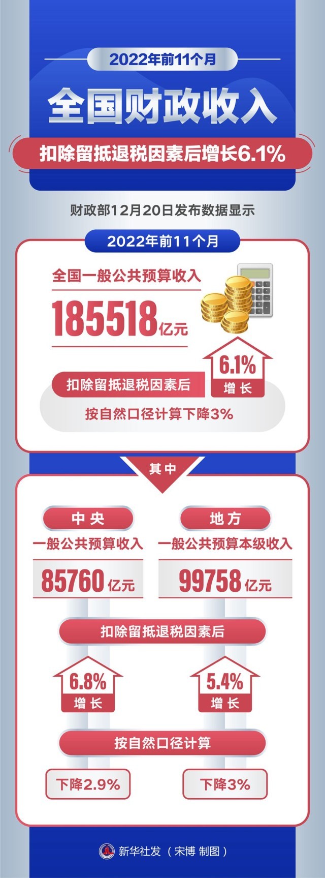新華社北京12月20日電(記者鄒多為、申鋮)財(cái)政部20日發(fā)布數(shù)據(jù)顯示,今年前11個(gè)月,全國一般公共預(yù)算收入185518億元,扣除留抵退稅因素后增長6.1%,按自然口徑計(jì)算下降3%。