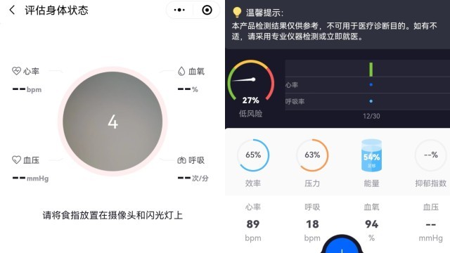 沙憲政分析稱,網(wǎng)上類似小程序和手機App是經(jīng)由手機攝像頭攝像,通過測量人體手指尖或面部動脈血管隨心臟搏動引起充盈的波動和顏色的變化(也就是光譜分析),來檢測心率和血氧飽和度等指標的。