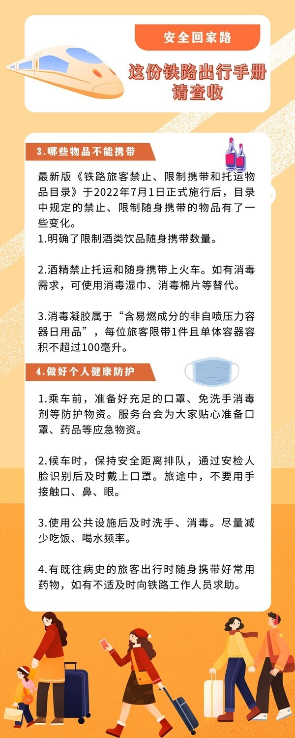 1月7日,為期40天的2023年春運(yùn)正式啟動。從目前的車票預(yù)售情況看,今年的春運(yùn)客流高峰發(fā)送量或?qū)⑦_(dá)到2019年疫情前水平。鐵路出行有哪些注意事項,哪些東西不能帶上火車?如何做好個人健康防護(hù)?這份出行手冊請查收。