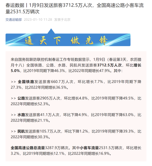全國(guó)高速公路總流量3287.9萬輛次。其中小客車流量2531.5萬輛次,環(huán)比增長(zhǎng)3.2%,比2019年同期增長(zhǎng)12.1%,比2022年同期增長(zhǎng)16.9%。