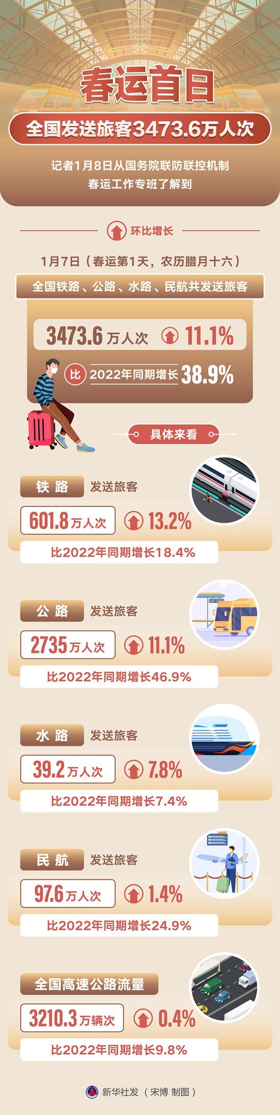 記者1月8日從國務(wù)院聯(lián)防聯(lián)控機制春運工作專班了解到,1月7日(春運第1天,農(nóng)歷臘月十六)全國鐵路、公路、水路、民航共發(fā)送旅客3473.6萬人次,環(huán)比增長11.1%,比2022年同期增長38.9%。宋博/制圖(新華社發(fā))