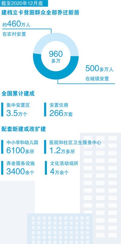 習近平總書記強調(diào):“易地搬遷是解決一方水土養(yǎng)不好一方人、實現(xiàn)貧困群眾跨越式發(fā)展的根本途徑,也是打贏脫貧攻堅戰(zhàn)的重要途徑?!秉h的十八大以來,全國累計建成集中安置區(qū)3.5萬個、安置住房266萬套。到2020年底,全國易地扶貧搬遷規(guī)劃建設(shè)任務(wù)全面完成,近千萬生活在“一方水土難養(yǎng)一方人”地方的建檔立卡貧困人口實現(xiàn)易地扶貧搬遷,搬入新家園、開啟新生活。