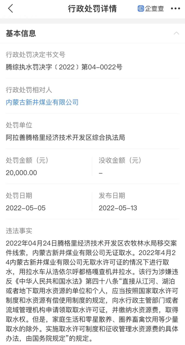 2022年該公司欠繳資源稅800多萬元、增值稅200多萬元,還因無取水許可證的情況下取水,被阿拉善騰格里經(jīng)濟技術開發(fā)區(qū)綜合執(zhí)法局行政處罰2萬元。