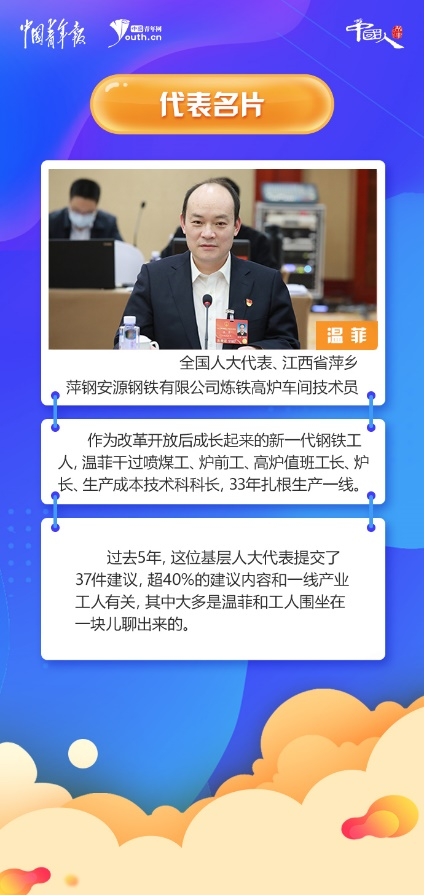 作為改革開放后成長起來的新一代鋼鐵工人,溫菲干過噴煤工、爐前工、高爐值班工長、爐長、生產(chǎn)成本技術科科長,33年扎根生產(chǎn)一線。過去5年,這位基層人大代表提交了37件建議,超40%的建議內容和一線產(chǎn)業(yè)工人有關,其中大多是溫菲和工人圍坐在一塊兒聊出來的。