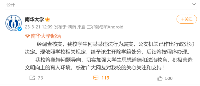 央視網(wǎng)消息:據(jù)@南華大學 微博最新消息,經(jīng)調(diào)查核實,該校學生何某某違法行為屬實,公安機關已作出行政處罰決定。現(xiàn)依照學校相關規(guī)定,給予該生開除學籍處分,后續(xù)將按程序辦理。
