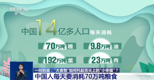中國農(nóng)業(yè)科學(xué)院研究員 國家食物與營養(yǎng)咨詢委員會主任 陳萌山:過去我們吃飯,主要是主糧,一大碗米飯或者一點(diǎn)咸菜,一點(diǎn)辣椒。那么現(xiàn)在不一樣了,我們一小碗米飯很多菜,不僅僅是主食,副食老百姓要求更高。我們講直接消費(fèi)的口糧,已經(jīng)由1978年的人均248公斤,下降到目前的130公斤,所以副食也成為主食了。為了適應(yīng)這樣一個新的形勢,總書記提出“大食物觀”。