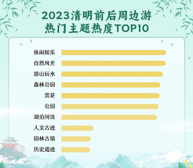 據(jù)某旅游票務(wù)平臺(tái)發(fā)布的《2023清明假期出游趨勢(shì)報(bào)告》,清明期間,本地及周邊短途出游是主流,出游主題上具有顯著的春游季特征?!秷?bào)告》顯示,清明假期(4月5日)前后周邊游的熱門(mén)主題按照熱度排序依次為休閑娛樂(lè)、自然風(fēng)光、游山玩水、森林公園、賞花、公園等。前十個(gè)熱門(mén)主題中,具有賞花踏青屬性的主題占據(jù)了六席。