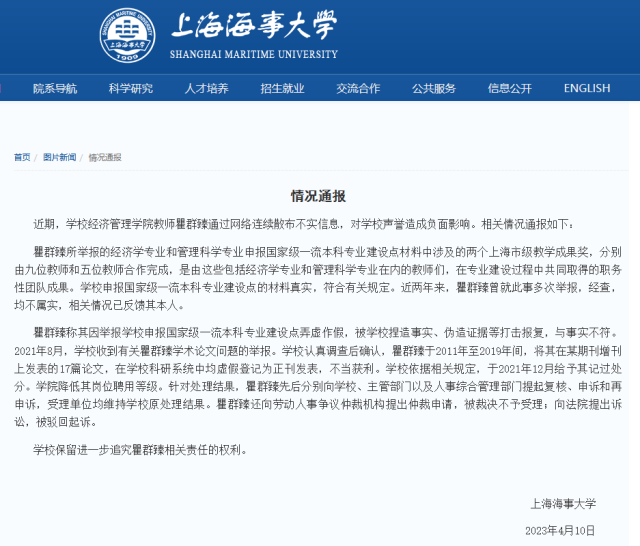 上海海事大學(xué)被舉報弄虛作假,校方發(fā)布情況通報:經(jīng)查,均不屬實