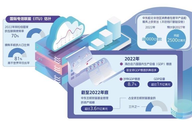 其次,中東消費(fèi)者對(duì)互聯(lián)網(wǎng)、大數(shù)據(jù)、金融科技、新能源等高科技產(chǎn)品和服務(wù)有著旺盛需求,而且有較高的收入水平和支付能力。據(jù)國(guó)際電信聯(lián)盟(ITU)估計(jì),2022年阿拉伯國(guó)家的互聯(lián)網(wǎng)使用率達(dá)70%,擁有手機(jī)的人口比例為81%,高于世界平均水平(73%)。據(jù)估計(jì),2022年,中東和北非地區(qū)消費(fèi)者在數(shù)字產(chǎn)品和服務(wù)上的支出(不包括IT基礎(chǔ)設(shè)施)約為1000億美元,預(yù)計(jì)到2027年將超過2500億美元。