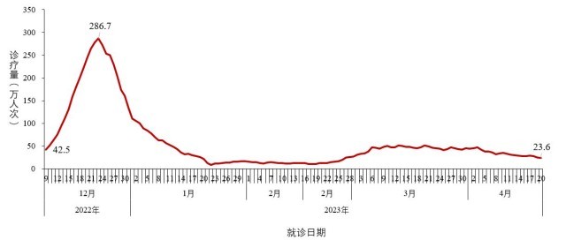 ?。ㄈ┏鞘邪l(fā)熱門診就診人數(shù)結(jié)果。全國(guó)二級(jí)以上醫(yī)療機(jī)構(gòu)和城市社區(qū)衛(wèi)生服務(wù)中心發(fā)熱門診(診室)就診人數(shù)于2022年12月22日達(dá)到峰值195.4萬(wàn)人次,隨后連續(xù)下降;1月23日后呈低位波動(dòng),約6周(2月24日-4月6日)的波動(dòng)增加及平臺(tái)波動(dòng)后,近2周(4月7日-4月20日)呈下降趨勢(shì),4月20日為16.8萬(wàn)人次,較峰值下降了91.4%(圖2-3)。