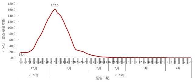 ?。ㄒ唬┰谠盒鹿诓《靖腥菊呓Y(jié)果。全國(guó)在院新冠病毒感染者于2023年1月5日達(dá)到峰值162.5萬(wàn)人,隨后持續(xù)下降;4月20日下降至3929例,較峰值減少了99.8%(圖3-1)。