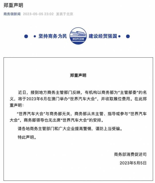 商務(wù)部聲明:從未主管、指導(dǎo)或參與“世界汽車大會”
