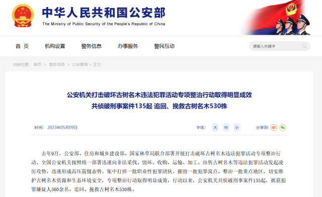 公安機(jī)關(guān)打擊破壞古樹名木違法犯罪活動(dòng)專項(xiàng)整治行動(dòng)取得明顯成效 追回、挽救古樹名木530株
