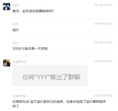 下一秒,群主現(xiàn)身并放出一張截圖,上面顯示求票的粉絲已被移除群聊。隨后群主寫道:“還是那句話,溢不溢價是自己的選擇,但是你選擇了溢價票那就拜拜了?!?/p>