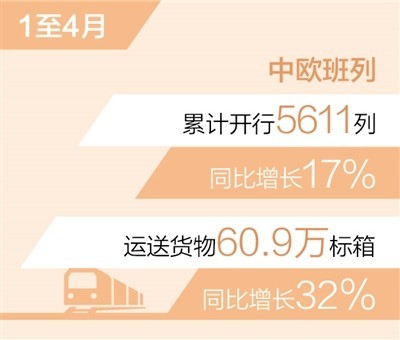 本報北京5月22日電 (記者李心萍)記者從中國國家鐵路集團有限公司獲悉:今年1至4月,中歐班列累計開行5611列、運送貨物60.9萬標箱,同比分別增長17%、32%,重箱率100%。其中,4月單月開行1459列、運送貨物16萬標箱,同比分別增長25%、45%。