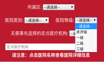 同時可選擇所屬區(qū)、醫(yī)院類別(定點(diǎn)中醫(yī)醫(yī)院、定點(diǎn)專科醫(yī)院、對外綜合等醫(yī)院等)、醫(yī)院等級,或輸入定點(diǎn)醫(yī)院名稱進(jìn)行詳細(xì)查詢。
