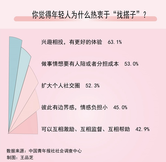 近日,中國青年報社社會調查中心聯合問卷網(wenjuan.com),對1335名受訪者進行的一項調查顯示,63.1%的受訪青年認為找“搭子”是因為興趣相投,有更好的體驗,53.0%的青年覺得是因為做事情想要有人陪或者分擔成本。