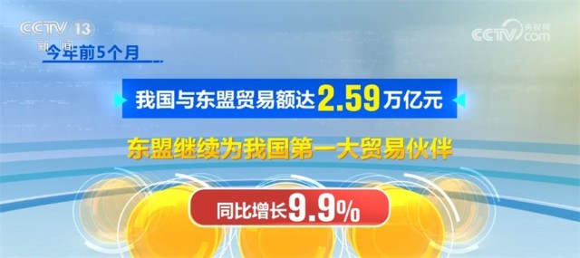今年前5個(gè)月,我國(guó)與東盟貿(mào)易額達(dá)2.59萬億元,東盟繼續(xù)為我國(guó)第一大貿(mào)易伙伴,同比增長(zhǎng)9.9%。