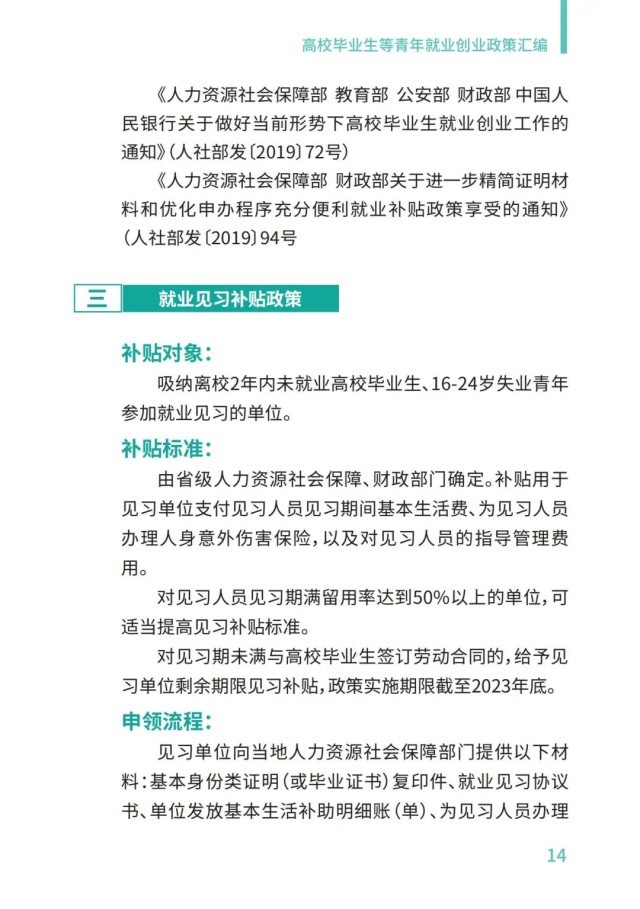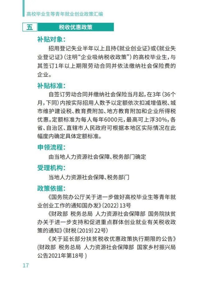 《匯編》系統(tǒng)梳理了國(guó)家有關(guān)部門出臺(tái)的促進(jìn)高校畢業(yè)生就業(yè)創(chuàng)業(yè)現(xiàn)行政策,聚焦高校畢業(yè)生求職就業(yè)需求,分為企業(yè)就業(yè)、基層就業(yè)、自主創(chuàng)業(yè)、能力提升、應(yīng)征入伍、就業(yè)見習(xí)、就業(yè)服務(wù)、就業(yè)手續(xù)、權(quán)益維護(hù)等九方面內(nèi)容。為便于高校畢業(yè)生和企業(yè)快速查閱相關(guān)政策,《匯編》還歸納整理了就業(yè)有關(guān)政策清單,包括6項(xiàng)面向企業(yè)(單位)吸納高校畢業(yè)生就業(yè)的補(bǔ)貼、稅收優(yōu)惠等政策,以及9項(xiàng)面向高校畢業(yè)生的補(bǔ)貼、資助等政策。