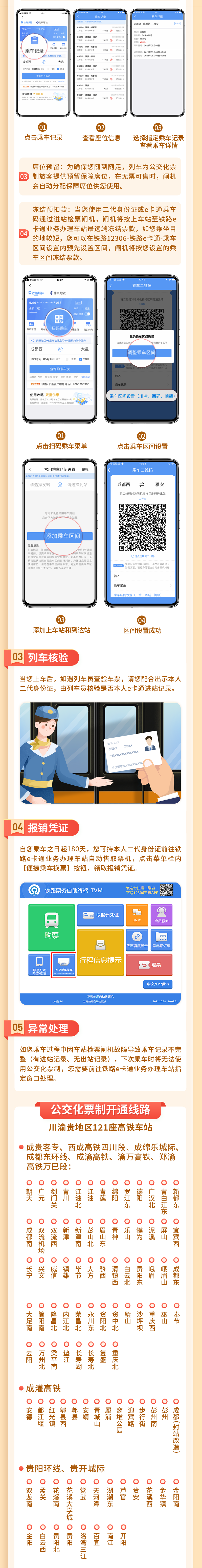 為進(jìn)一步提升通勤旅客出行體驗,中國鐵路成都局集團(tuán)有限公司管內(nèi)的川渝貴地區(qū)121座高鐵車站啟用公交化票制。已開通鐵路e卡通的旅客在鐵路12306客戶端-鐵路e卡通主頁,啟用刷證模式,即可使用二代身份證或e卡通乘車碼,實現(xiàn)無需購票,刷證或掃碼即走。