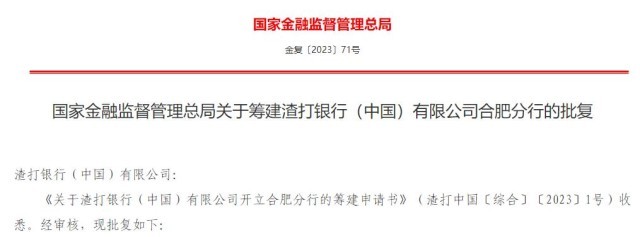 央視網(wǎng)消息:近日,國(guó)家金融監(jiān)督管理總局發(fā)布《關(guān)于籌建渣打銀行(中國(guó))有限公司合肥分行的批復(fù)》。主要內(nèi)容如下: