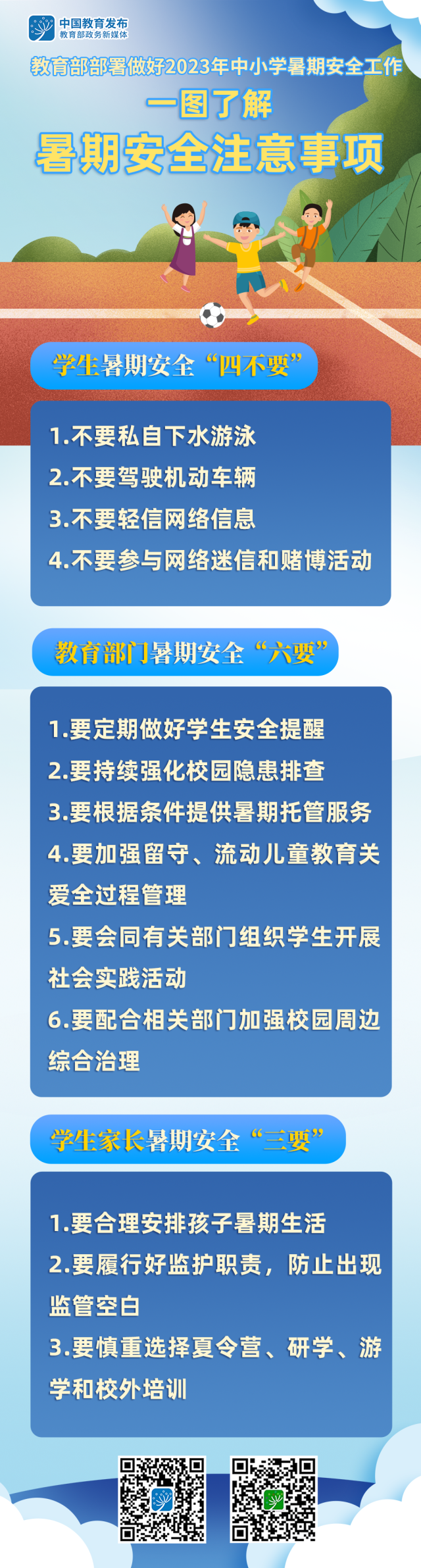 暑假來臨,教育部近日印發(fā)《關(guān)于做好2023年中小學(xué)暑期安全工作的通知》,部署做好相關(guān)工作。和教育小微通過一組大圖了解暑期安全注意事項(xiàng)↓↓↓