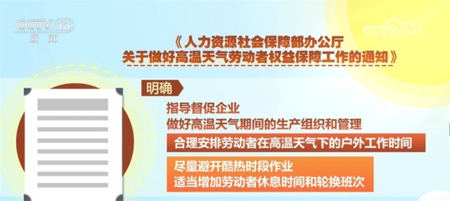 《通知》明確,指導督促企業(yè)做好高溫天氣期間的生產組織和管理,合理安排勞動者在高溫天氣下的戶外工作時間,盡量避開酷熱時段作業(yè),適當增加勞動者休息時間和輪換班次。