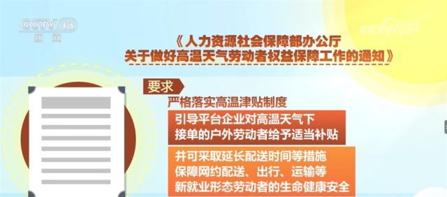 央視網(wǎng)消息:近日,人力資源和社會保障部就做好高溫天氣勞動者權益保障工作印發(fā)《通知》。其中,對快遞、外賣人員等靈活就業(yè)人員的高溫天氣下如何保障做出了專門的要求。