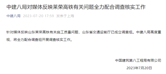 央視網(wǎng)消息:據(jù)“中建八局”公眾號消息,中國建筑第八工程局有限公司表示,針對媒體反映山東萊榮高鐵有關施工質量問題,山東省交通運輸廳已成立調查組。中建八局高度重視,將全力配合調查組開展調查核實工作。