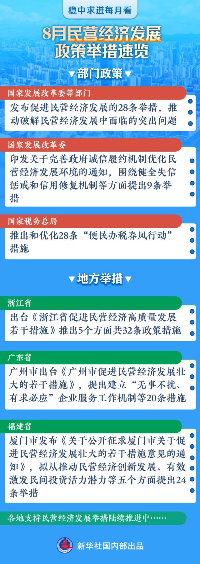浙江省出臺促進民營經(jīng)濟高質(zhì)量發(fā)展32條措施,提出向民營企業(yè)推介“三張項目清單”,為民間資本更好了解和參與重大項目提供平臺;廣州市出臺促進民營經(jīng)濟發(fā)展壯大的20條措施,提出建立“無事不擾、有求必應(yīng)”企業(yè)服務(wù)工作機制等;深圳市針對備受民營企業(yè)關(guān)注的放寬市場準入、保護合法權(quán)益、清理拖欠企業(yè)賬款等方面,提出20條精準有力舉措……