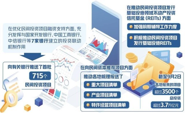 為貫徹落實(shí)《意見》,國(guó)家發(fā)展改革委印發(fā)了《關(guān)于進(jìn)一步抓好抓實(shí)促進(jìn)民間投資工作努力調(diào)動(dòng)民間投資積極性的通知》,提出了17項(xiàng)有針對(duì)性的具體措施。據(jù)介紹,在優(yōu)化民間投資項(xiàng)目融資支持方面,充分發(fā)揮與國(guó)家開發(fā)銀行、中國(guó)工商銀行、中信銀行等7家銀行建立的投貸聯(lián)動(dòng)機(jī)制作用,向有關(guān)銀行推送了首批715個(gè)民間投資項(xiàng)目,請(qǐng)有關(guān)金融機(jī)構(gòu)按照市場(chǎng)化、法治化原則,自主選擇符合條件的項(xiàng)目給予金融支持。在向民間資本推薦項(xiàng)目方面,推動(dòng)各地梳理報(bào)送了重大項(xiàng)目清單、產(chǎn)業(yè)項(xiàng)目清單、特許經(jīng)營(yíng)項(xiàng)目清單。截至9月2日,各地報(bào)來(lái)的項(xiàng)目超過(guò)3500個(gè),總投資超過(guò)3.7萬(wàn)億元。在推動(dòng)民間投資項(xiàng)目發(fā)行基礎(chǔ)設(shè)施領(lǐng)域不動(dòng)產(chǎn)投資信托基金(REITs)方面,加強(qiáng)前期輔導(dǎo)工作力度,積極推動(dòng)民間投資項(xiàng)目發(fā)行基礎(chǔ)設(shè)施REITs。近日,國(guó)家發(fā)展改革委向證監(jiān)會(huì)推薦了金風(fēng)科技風(fēng)力發(fā)電項(xiàng)目,這是推薦的首單民間投資清潔能源REITs項(xiàng)目。
