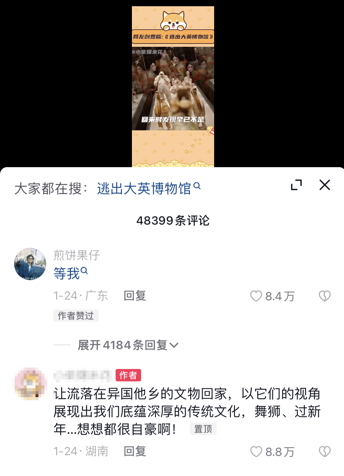 《逃出大英博物館》由兩位90后自媒體人“煎餅果仔”和“夏天妹妹噢”共同創(chuàng)作。短片上線前期,正逢大英博物館被多個國家要求歸還本國文物,戳中了每一個中國人強(qiáng)烈期盼流失海外文物早日回家的內(nèi)心。