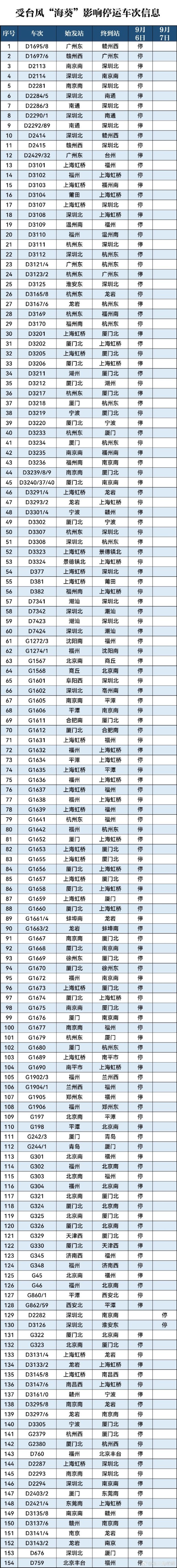 受臺風“海葵”影響部分列車停運,車次信息公布