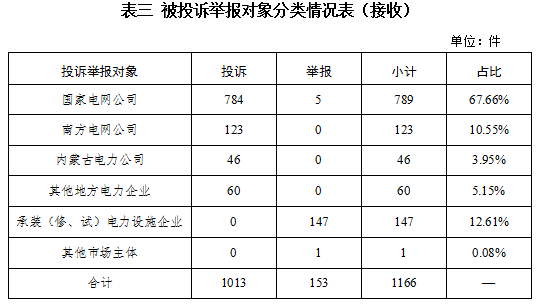 從被投訴舉報(bào)對(duì)象看,供電企業(yè)921件、占投訴舉報(bào)總數(shù)的86.07%,其中國(guó)家電網(wǎng)公司712件、占比66.66%,南方電網(wǎng)公司107件、占比10.01%,內(nèi)蒙古電力公司38件、占比3.55%,其他地方電力企業(yè)64件、占比5.85%;承裝(修、試)電力設(shè)施企業(yè)148件、占比13.84%;其他市場(chǎng)主體1件、占比0.09%。