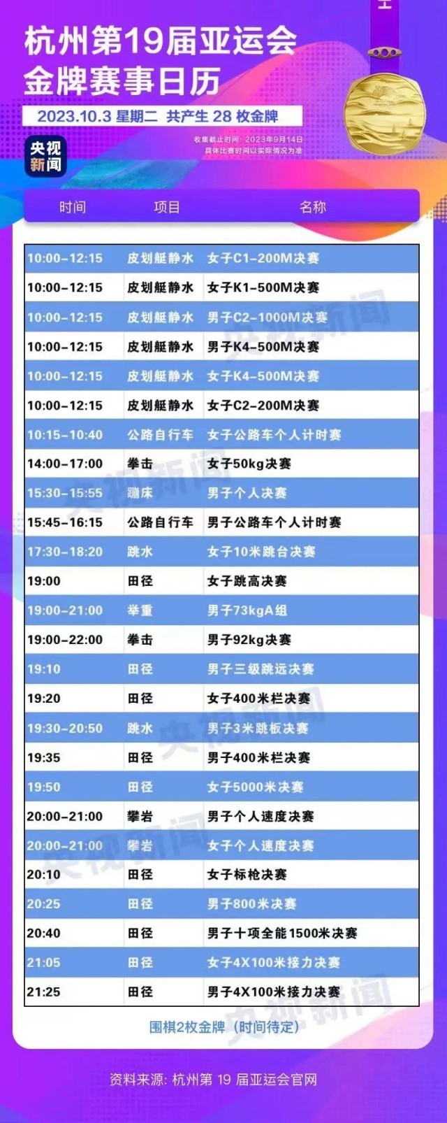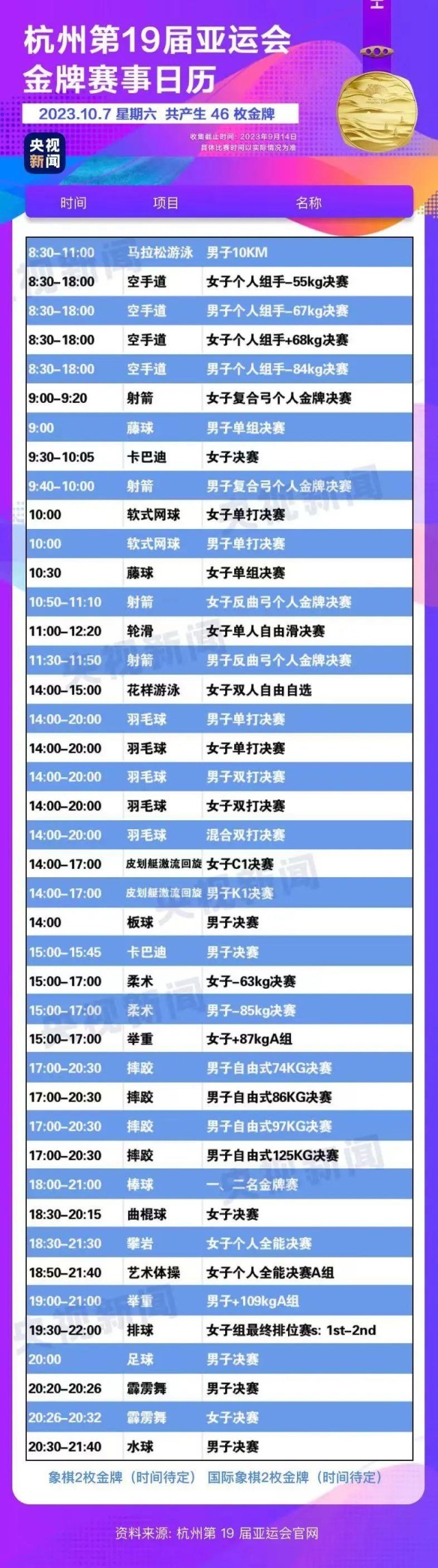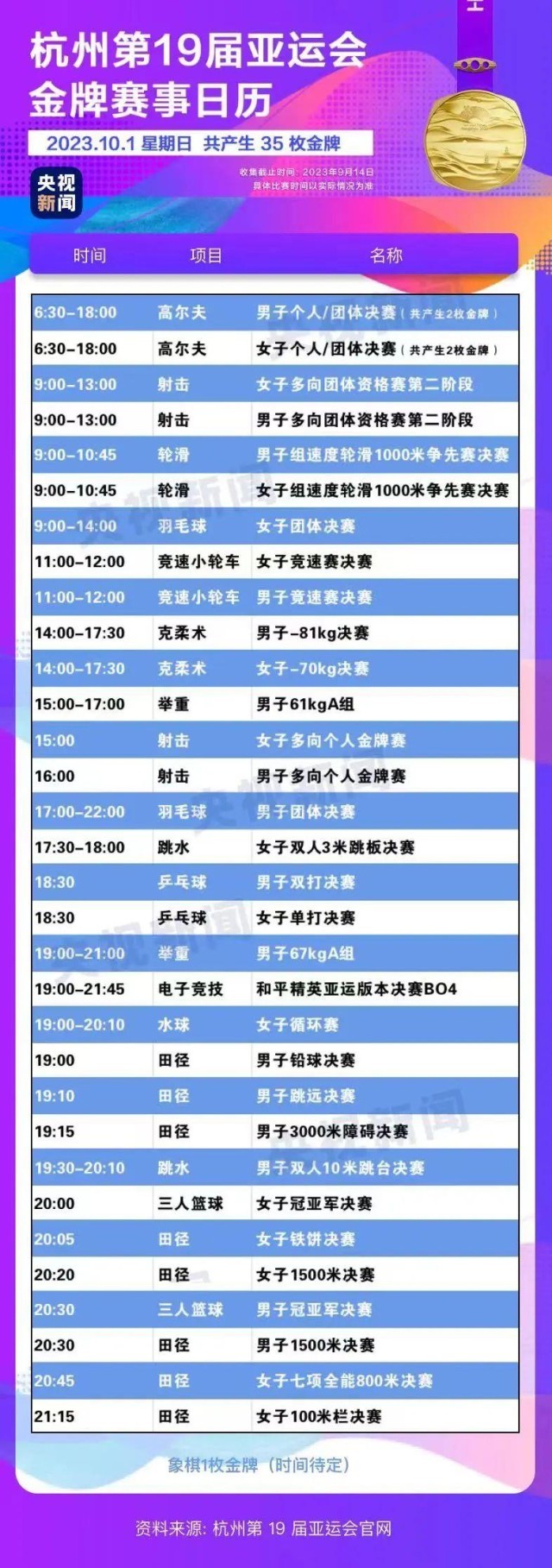 最后,小編還為你準備了一份杭州亞運會金牌賽事日歷,日歷里包含所有481枚金牌產(chǎn)生的時間?;瑒邮种?,看看你關注的比賽在哪天舉行。