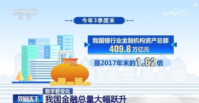 最新數(shù)據(jù)顯示,今年3季度末,我國銀行業(yè)金融機(jī)構(gòu)資產(chǎn)總額為409.8萬億元,是2017年末的1.62倍。銀行業(yè)金融機(jī)構(gòu)本外幣貸款余額239.5萬億元,是2017年末的1.91倍。本外幣存款余額286.6萬億元,是2017年末的1.69倍。保險(xiǎn)方面,3季度末,保險(xiǎn)公司總資產(chǎn)29.6萬億元,是2017年末的1.77倍。從2018年到今年3季度末,保險(xiǎn)公司賠款與給付累計(jì)支出8.4萬億元,保險(xiǎn)的保障功能日益突出。