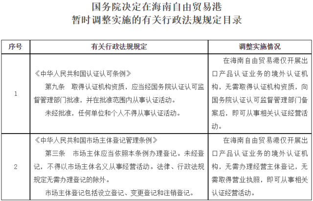 一、為支持海南自由貿(mào)易港建設,按照《海南自由貿(mào)易港建設總體方案》,同意自即日起在海南自由貿(mào)易港暫時調(diào)整實施《中華人民共和國認證認可條例》《中華人民共和國市場主體登記管理條例》有關(guān)規(guī)定(目錄附后),在海南自由貿(mào)易港僅開展出口產(chǎn)品認證業(yè)務的境外認證機構(gòu),無需取得認證機構(gòu)資質(zhì)和辦理經(jīng)營主體登記,向國務院認證認可監(jiān)督管理部門備案后,即可開展出口產(chǎn)品認證業(yè)務,認證結(jié)果僅限出口企業(yè)境外使用。備案條件和程序由國務院認證認可監(jiān)督管理部門制定。
