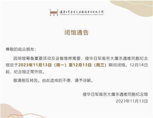 記者從侵華日軍南京大屠殺遇難同胞紀(jì)念館了解到,因場(chǎng)館籌備重要活動(dòng)及設(shè)備維修需要,該館定于2023年11月13日(周一)至12月13日(周三)期間閉館,12月14日起正常開(kāi)放。