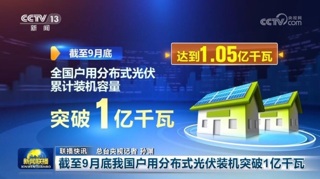 截至9月底,全國戶用分布式光伏累計(jì)裝機(jī)容量突破1億千瓦,達(dá)到1.05億千瓦。今年前9個(gè)月,全國戶用分布式光伏新增裝機(jī)3297.7萬千瓦,是去年全年的1.3倍。