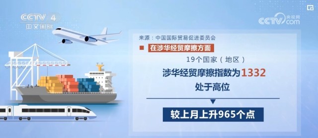在涉華經(jīng)貿摩擦方面,19個國家(地區(qū))涉華經(jīng)貿摩擦指數(shù)為1332,處于高位,較上月上升965個點。
