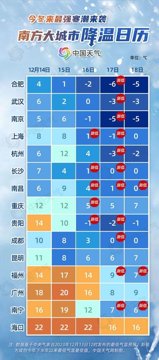 從南方大城市降溫日歷來看,未來五天,合肥、武漢、南京、上海、杭州、貴陽最低氣溫都將逐步下降到冰點以下。南昌16日至18日最低氣溫或連創(chuàng)新低,貴陽最低氣溫將從14℃降至-2℃,降幅可達16℃。